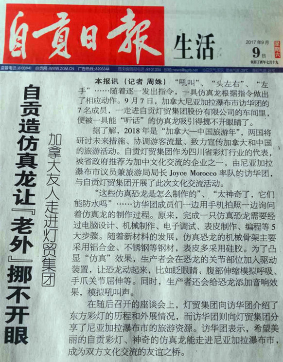 為進(jìn)一步擴(kuò)大中加雙方經(jīng)貿(mào)往來和人文交往,推進(jìn)“2018中加旅游年”的交流合作。受四川省人民政府邀請,尼亞加拉瀑布市政府訪問團(tuán)一行7人于9月7日-9日到自貢燈貿(mào)集團(tuán)、四川藝思特彩燈文化傳播有限公司進(jìn)行訪問考察。