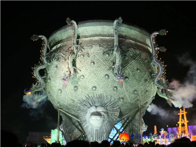 東方彩燈精心設(shè)計(jì)制作的“九龍鼎”燈組采用景德鎮(zhèn)青花玲瓏瓷具杯、羹、匙、盅、盤(pán)、碟、碗等近30萬(wàn)件手工捆扎而成,主體為鋼結(jié)構(gòu);鼎高和直徑均為18米,最大處直徑26米,總重近100噸。