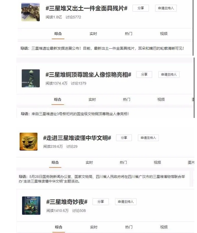 新浪微博話題 #三星堆又出土一件金面具殘片##三星堆銅頂尊跪坐人像驚艷亮相# #走進(jìn)三星堆讀懂中華文明##三星堆奇妙夜##三星堆奇妙夜直播#等相關(guān)話題累計(jì)閱讀量都很高!