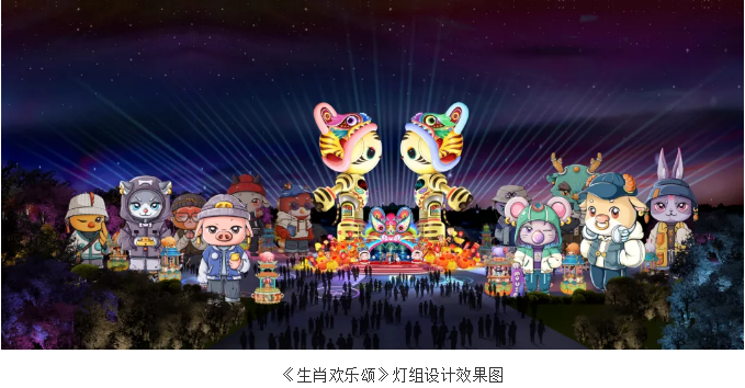 自貢燈貿(mào)集團(tuán)承制的華僑城·第28屆自貢國(guó)際恐龍燈會(huì)大型場(chǎng)景沉浸式大型燈組《生肖歡樂頌》以“虎年歡歌千里錦 十二生肖賀新春”為主題,呈現(xiàn)十二生肖動(dòng)物的現(xiàn)代版組合,子鼠丑牛,寅虎卯兔顛覆傳統(tǒng)生肖神話形象,以其炫目的賽博朋克感,獨(dú)一無二的國(guó)潮風(fēng)格,酷炫來襲。蘊(yùn)含國(guó)潮新風(fēng)內(nèi)核社會(huì)圖景的《生肖歡樂頌》揭開了獨(dú)具特色的傳統(tǒng)生肖文化潮玩一角,必將成為本屆燈會(huì)的打卡勝地。