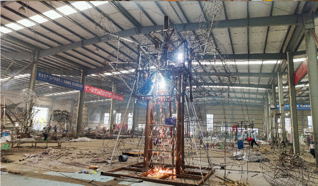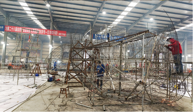 走進(jìn)燈貿(mào)集團(tuán)生產(chǎn)現(xiàn)場(chǎng),呈現(xiàn)眼前的是一篇繁忙景象。近200名東方彩燈的工匠按照放樣、造型、噴涂、電器安裝、裱糊、美術(shù)處理等生產(chǎn)流程,井然有序、熱火朝天地開展生產(chǎn)。但見,造型師焊槍焰火、飛火流星;電器師神工妙力,串接璀璨;裱糊師巧奪天工,斑斕溢彩;美術(shù)師鬼斧神工,爐火純青......