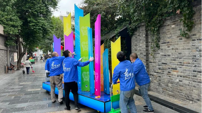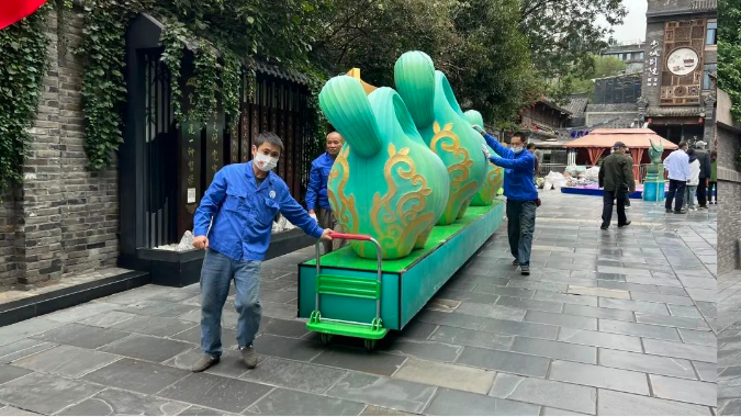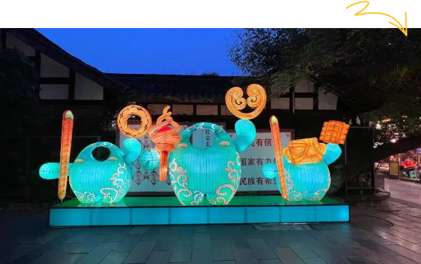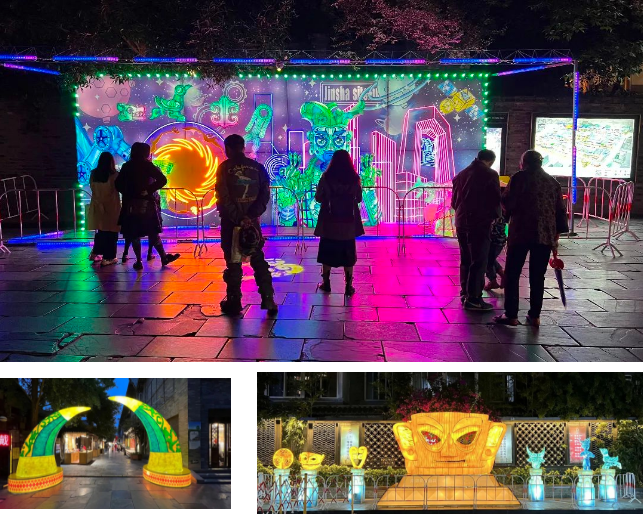 滿(mǎn)繪彩色圖案的金沙象牙燈組、文物造型設(shè)計(jì)燈組《嗚嚕?!?,演繹著傳統(tǒng)文化的“國(guó)潮”新風(fēng)尚,彰顯著文創(chuàng)帶給這座城市的新鮮感和創(chuàng)造力。分布在寬窄巷子景區(qū)燈組,讓游客一腳踏入光影幻境中的古蜀王國(guó)。