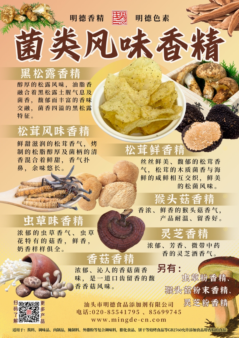 汕頭市明德食品添加劑有限公司的菌類風(fēng)味香精系列,涵蓋黑松露、松茸、蟲草、猴頭菇、靈芝、香菇等多種風(fēng)味,并配有粉末型產(chǎn)品。產(chǎn)品菌香真實(shí)、留香持久、層次豐富,適用于湯料包、醬料、調(diào)味品、肉制品、腌制料及外撒粉、復(fù)合調(diào)味料,膨化食品、餅干等焙烤食品等B端應(yīng)用,幫助工廠打造具有辨識度的菌類風(fēng)味產(chǎn)品。